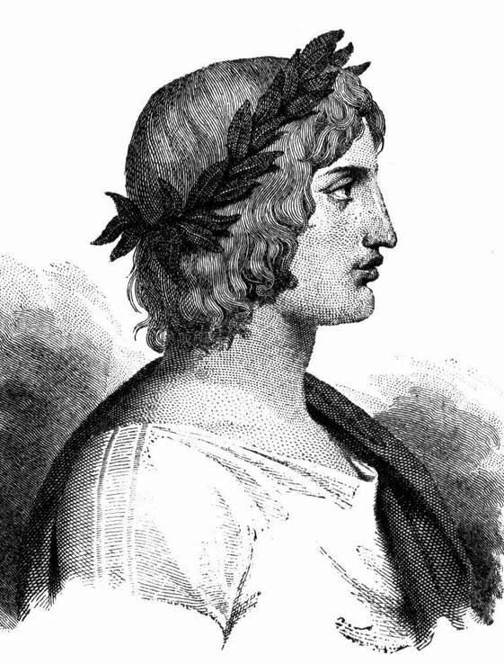 '...Brændende bad han, og bønnen blev hørt av Foibos Apollon. Barsk steg han ned fra Olympos' tind med vrede i hjertet. Sølvbuen bar han paa akslen og koggerets lukkede gjemme. Pilene klang paa hans skuldre, da guden i flammende vrede hastet avsted mot sit maal, og mørkt var hans aasyn som natten. Langt fra skibene satte han sig og sendte med vælde pilen fra strengen, og sølvbuens klang var grufuld at høre. Først tok han sigte paa muldyr og fotrappe hunder i leiren; derefter skjøt han paa mændene selv og de smertende piler rammet dem altid, og luerne steg fra talrike likbaal...'/Første sang: Vreden. Pesten.(kilde:https://www.mihle.no/iliaden/#første-sang.-vreden.-pesten.)